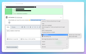 Lineared It to darmowe rozszerzenie do przeglądarki Chrome, które znacznie ułatwia proces tworzenia zgłoszeń w systemie Linear z poziomu platform GitHub i BitBucket. Dzięki temu narzędziu, użytkownicy mogą szybko przekształcać zauważone błędy, pomysły na poprawki lub zadania bez konieczności przełączania się między kartami. Wystarczy zaznaczyć tekst, kliknąć prawym przyciskiem myszy i wybrać opcję 'Quickly log a Linear ticket'. Zaznaczona treść oraz link do strony zostaną automatycznie dodane jako nowe zadanie w Linear.